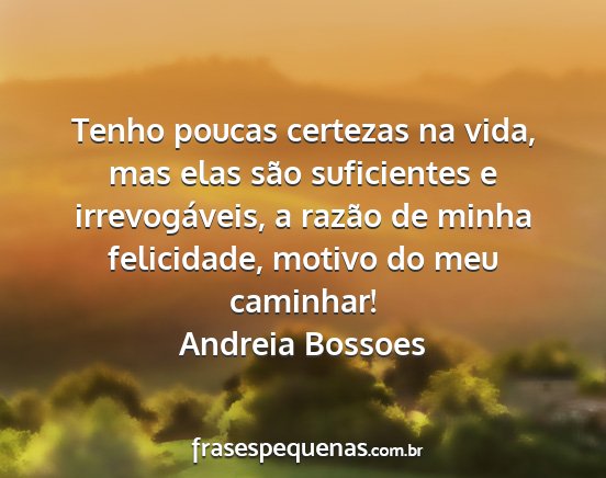 Tenho poucas certezas na vida, mas elas são suficientes e irrevogáveis, a razão de minha felicidade, motivo do meu caminhar!Andreia Bossoes