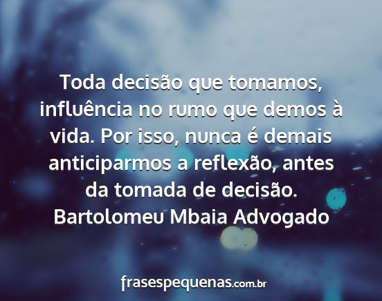 Toda decisão que tomamos, influência no rumo que demos à vida. Por isso, nunca é demais anticiparmos a reflexão, antes da tomada de decisão.Bartolomeu Mbaia Advogado