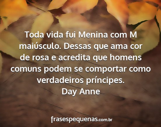 Toda vida fui Menina com M maiúsculo. Dessas que ama cor de rosa e acredita que homens comuns podem se comportar como verdadeiros príncipes.Day Anne