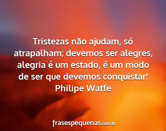 Tristezas não ajudam, só atrapalham; devemos ser alegres, alegria é um estado, é um modo de ser que devemos conquistar!Philipe Watfe
