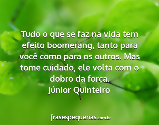 Tudo o que se faz na vida tem efeito boomerang, tanto para você como para os outros. Mas tome cuidado, ele volta com o dobro da força.Júnior Quinteiro