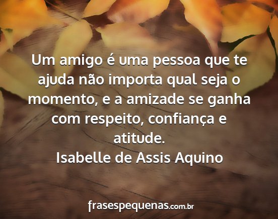 Um amigo é uma pessoa que te ajuda não importa qual seja o momento, e a amizade se ganha com respeito, confiança e atitude.Isabelle de Assis Aquino