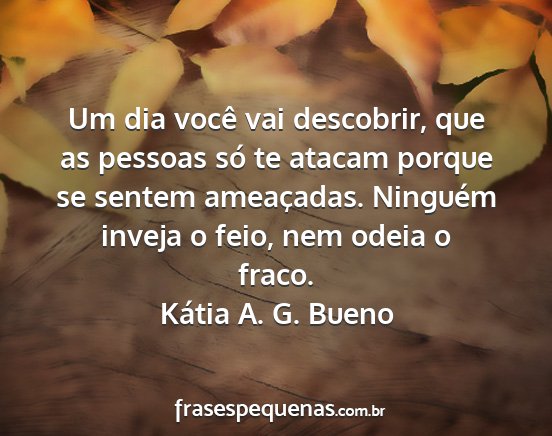 Um dia você vai descobrir, que as pessoas só te atacam porque se sentem ameaçadas. Ninguém inveja o feio, nem odeia o fraco.Kátia A. G. Bueno
