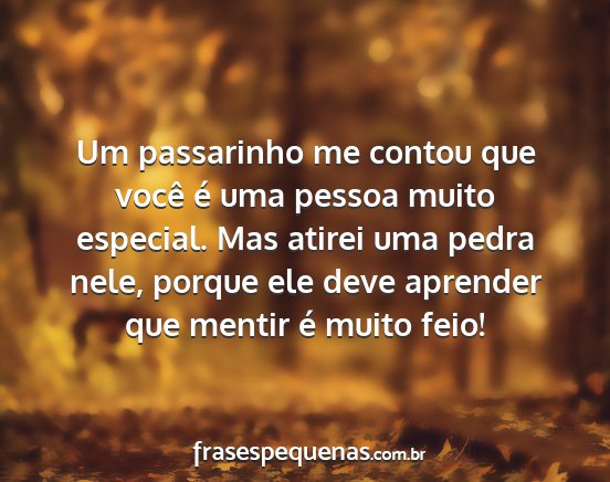 Um passarinho me contou que você é uma pessoa muito especial. Mas atirei uma pedra nele, porque ele deve aprender que mentir é muito feio!