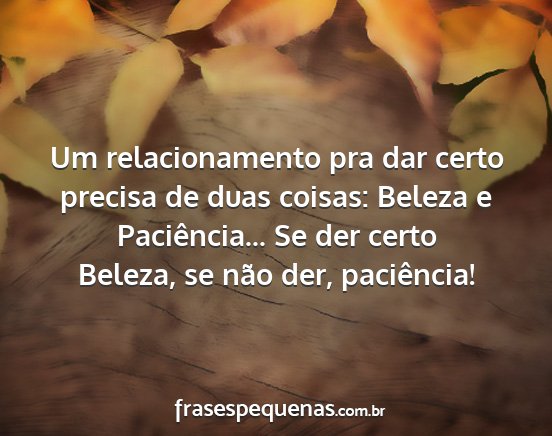 Um relacionamento pra dar certo precisa de duas coisas: Beleza e Paciência... Se der certo Beleza, se não der, paciência!
