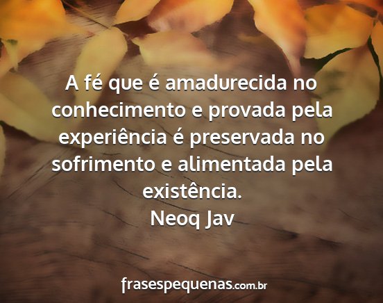 A fé que é amadurecida no conhecimento e provada pela experiência é preservada no sofrimento e alimentada pela existência.Neoq Jav
