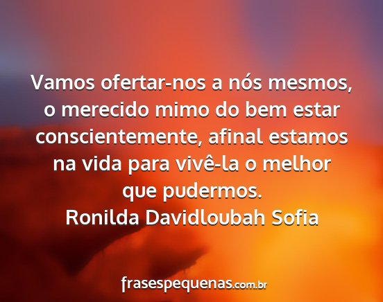 Vamos ofertar-nos a nós mesmos, o merecido mimo do bem estar conscientemente, afinal estamos na vida para vivê-la o melhor que pudermos.Ronilda Davidloubah Sofia