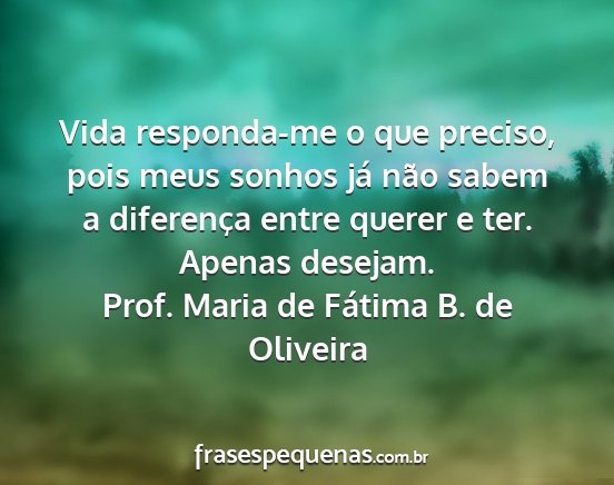 Vida responda-me o que preciso, pois meus sonhos já não sabem a diferença entre querer e ter. Apenas desejam.Prof. Maria de Fátima B. de Oliveira