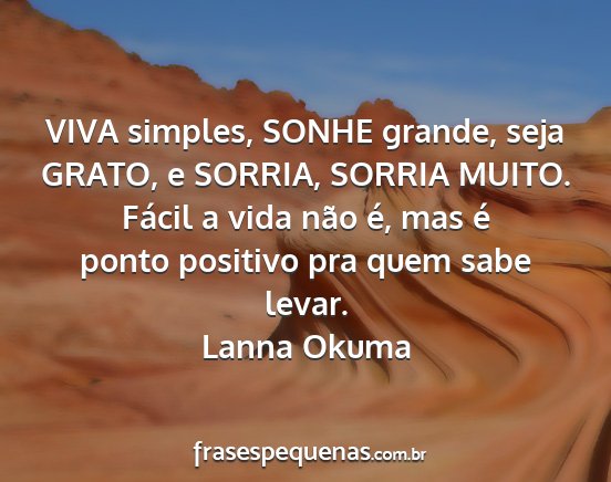 VIVA simples, SONHE grande, seja GRATO, e SORRIA, SORRIA MUITO. Fácil a vida não é, mas é ponto positivo pra quem sabe levar.Lanna Okuma