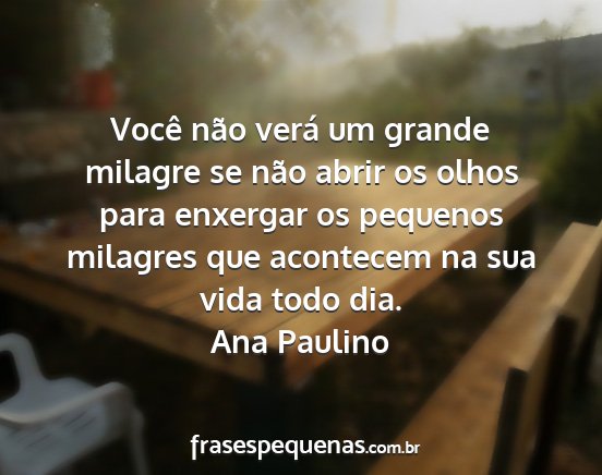 Você não verá um grande milagre se não abrir os olhos para enxergar os pequenos milagres que acontecem na sua vida todo dia.Ana Paulino