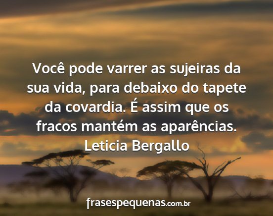 Você pode varrer as sujeiras da sua vida, para debaixo do tapete da covardia. É assim que os fracos mantém as aparências.Leticia Bergallo