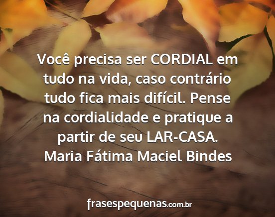 Você precisa ser CORDIAL em tudo na vida, caso contrário tudo fica mais difícil. Pense na cordialidade e pratique a partir de seu LAR-CASA.Maria Fátima Maciel Bindes