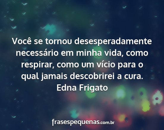 Você se tornou desesperadamente necessário em minha vida, como respirar, como um vício para o qual jamais descobrirei a cura.Edna Frigato