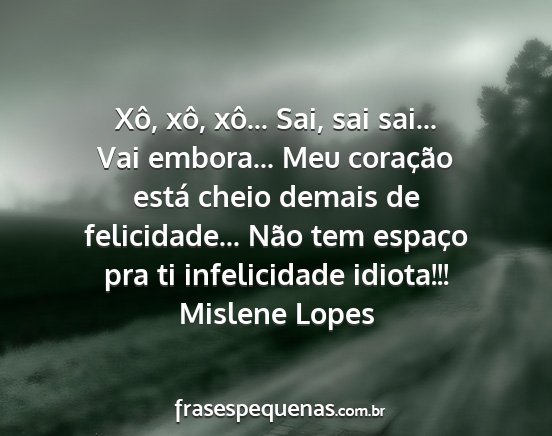 Xô, xô, xô... Sai, sai sai... Vai embora... Meu coração está cheio demais de felicidade... Não tem espaço pra ti infelicidade idiota!!!Mislene Lopes