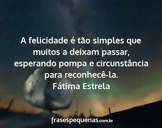A felicidade é tão simples que muitos a deixam passar, esperando pompa e circunstância para reconhecê-la.Fátima Estrela