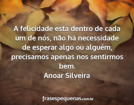 A felicidade esta dentro de cada um de nós, não há necessidade de esperar algo ou alguém, precisamos apenas nos sentirmos bem.Anoar Silveira