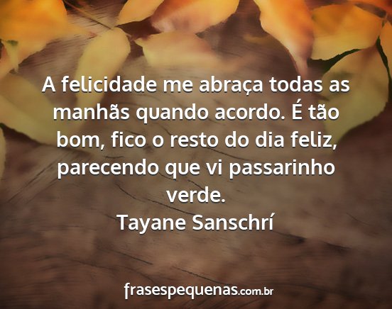 A felicidade me abraça todas as manhãs quando acordo. É tão bom, fico o resto do dia feliz, parecendo que vi passarinho verde.Tayane Sanschrí