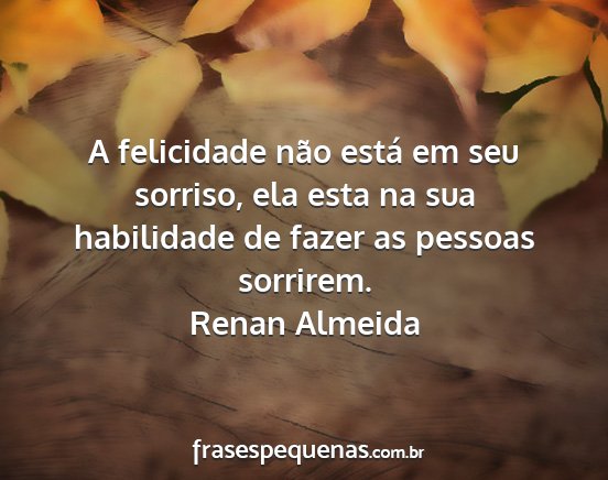 A felicidade não está em seu sorriso, ela esta na sua habilidade de fazer as pessoas sorrirem.Renan Almeida