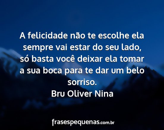 A felicidade não te escolhe ela sempre vai estar do seu lado, só basta você deixar ela tomar a sua boca para te dar um belo sorriso.Bru Oliver Nina