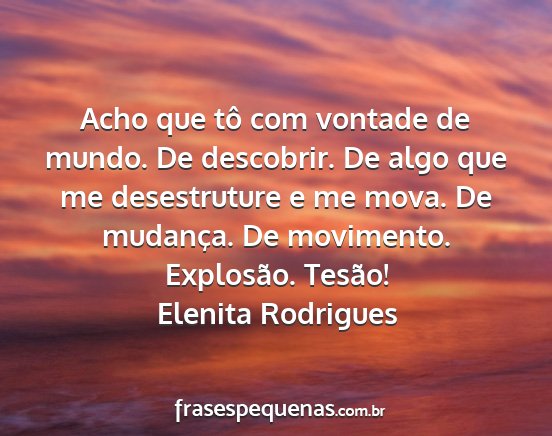 Acho que tô com vontade de mundo. De descobrir. De algo que me desestruture e me mova. De mudança. De movimento. Explosão. Tesão!Elenita Rodrigues