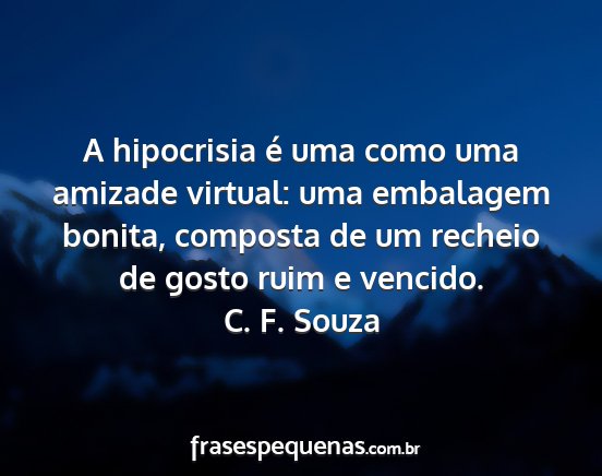 A hipocrisia é uma como uma amizade virtual: uma embalagem bonita, composta de um recheio de gosto ruim e vencido.C. F. Souza