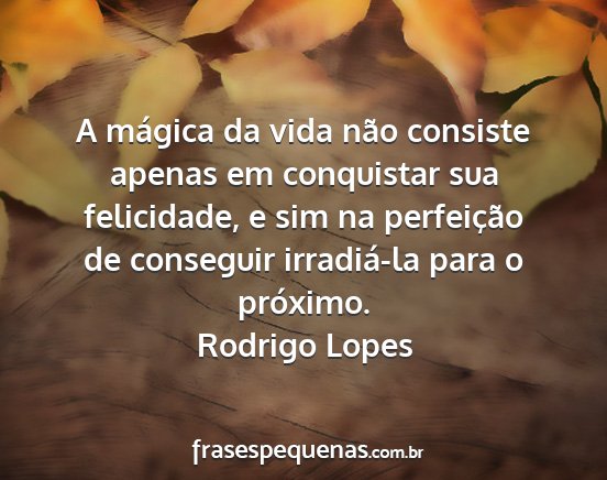 A mágica da vida não consiste apenas em conquistar sua felicidade, e sim na perfeição de conseguir irradiá-la para o próximo.Rodrigo Lopes