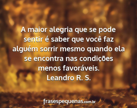 A maior alegria que se pode sentir é saber que você faz alguém sorrir mesmo quando ela se encontra nas condições menos favoráveis.Leandro R. S.