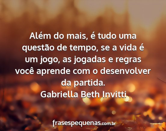 Além do mais, é tudo uma questão de tempo, se a vida é um jogo, as jogadas e regras você aprende com o desenvolver da partida.Gabriella Beth Invitti
