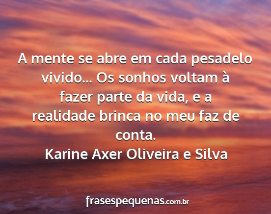 A mente se abre em cada pesadelo vivido... Os sonhos voltam à fazer parte da vida, e a realidade brinca no meu faz de conta.Karine Axer Oliveira e Silva