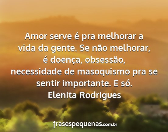 Amor serve é pra melhorar a vida da gente. Se não melhorar, é doença, obsessão, necessidade de masoquismo pra se sentir importante. E só.Elenita Rodrigues