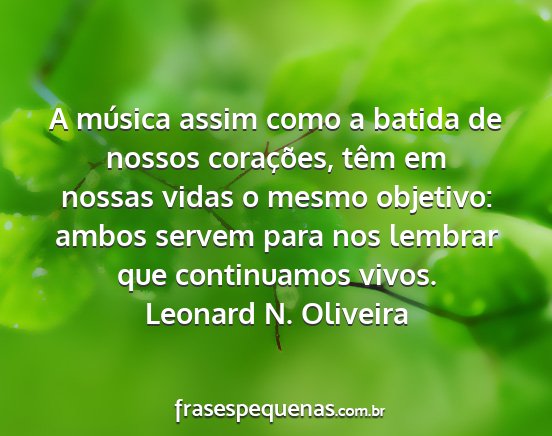 A música assim como a batida de nossos corações, têm em nossas vidas o mesmo objetivo: ambos servem para nos lembrar que continuamos vivos.Leonard N. Oliveira