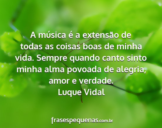A música é a extensão de todas as coisas boas de minha vida. Sempre quando canto sinto minha alma povoada de alegria, amor e verdade.Luque Vidal
