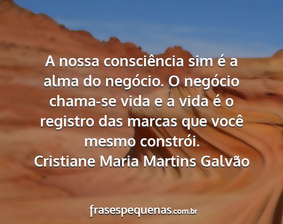 A nossa consciência sim é a alma do negócio. O negócio chama-se vida e a vida é o registro das marcas que você mesmo constrói.Cristiane Maria Martins Galvão