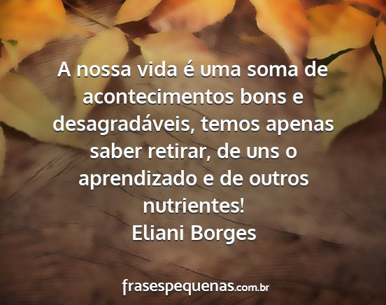 A nossa vida é uma soma de acontecimentos bons e desagradáveis, temos apenas saber retirar, de uns o aprendizado e de outros nutrientes!Eliani Borges