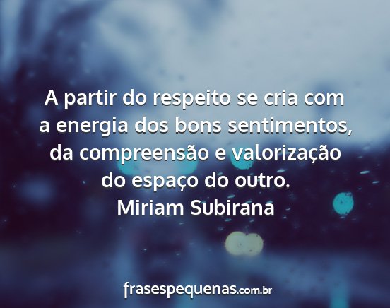 A partir do respeito se cria com a energia dos bons sentimentos, da compreensão e valorização do espaço do outro.Miriam Subirana