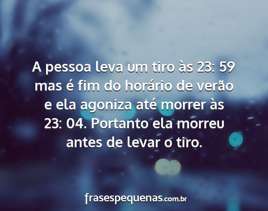 A pessoa leva um tiro às 23: 59 mas é fim do horário de verão e ela agoniza até morrer às 23: 04. Portanto ela morreu antes de levar o tiro.